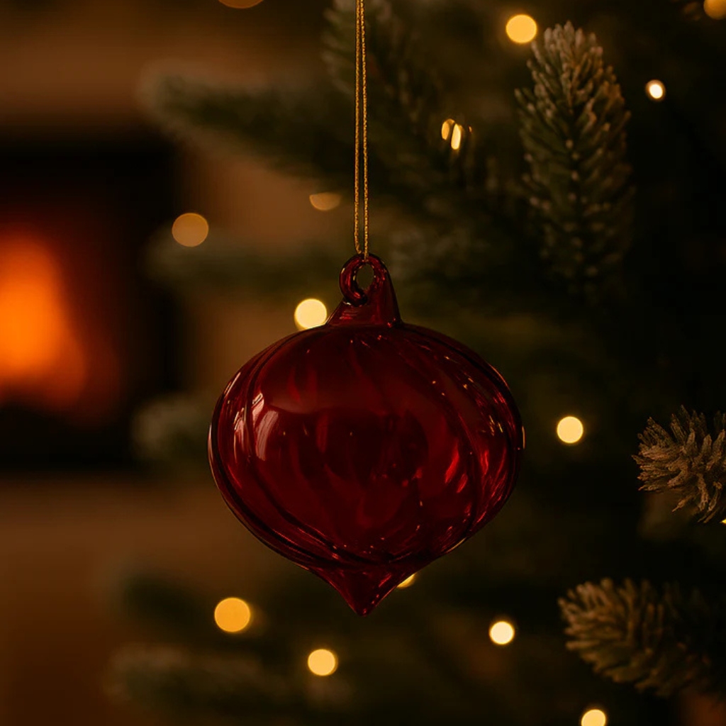 Apportez une touche d’élégance à votre sapin avec cette boule de Noël en verre soufflé rouge. Sa forme originale légèrement facettée et ses reflets profonds en font une pièce phare de votre décoration festive. Accrochée à une branche, elle capte la lumière et crée une ambiance chaleureuse et raffinée.