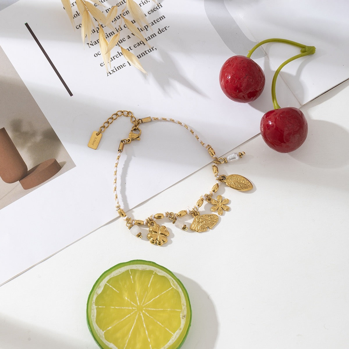Matières : cordon tressé, perles et pendentifs en acier inoxydable doré
