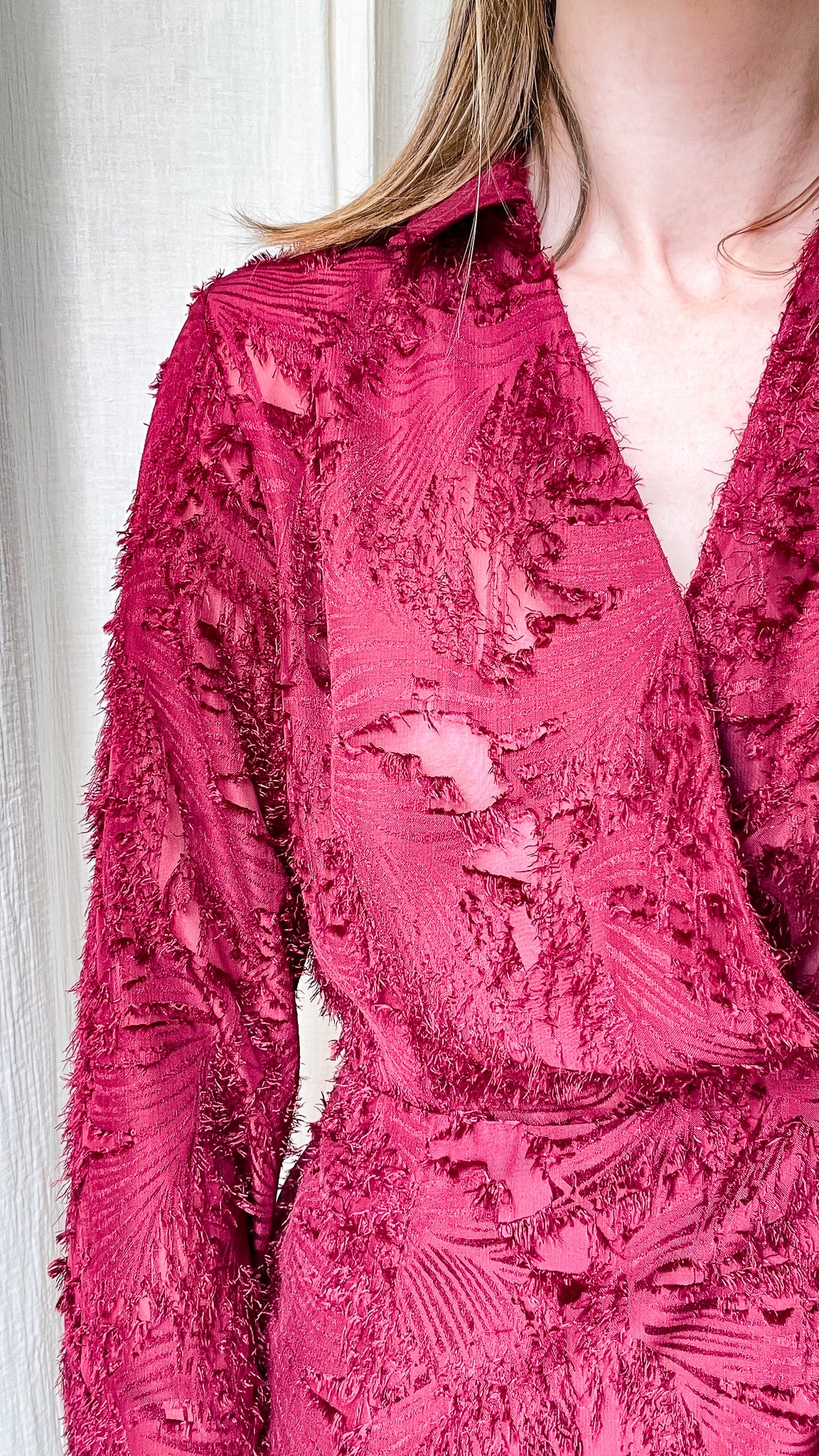 La Robe Olga se distingue par son tissu texturé aux effets relief qui apportent du caractère et une touche de sophistication. Dans une teinte rouge profond, elle attire le regard tout en conservant une coupe élégante et féminine. Sa forme portefeuille croisée et son col chemise créent une silhouette moderne, idéale pour vos soirées comme pour vos événements spéciaux.