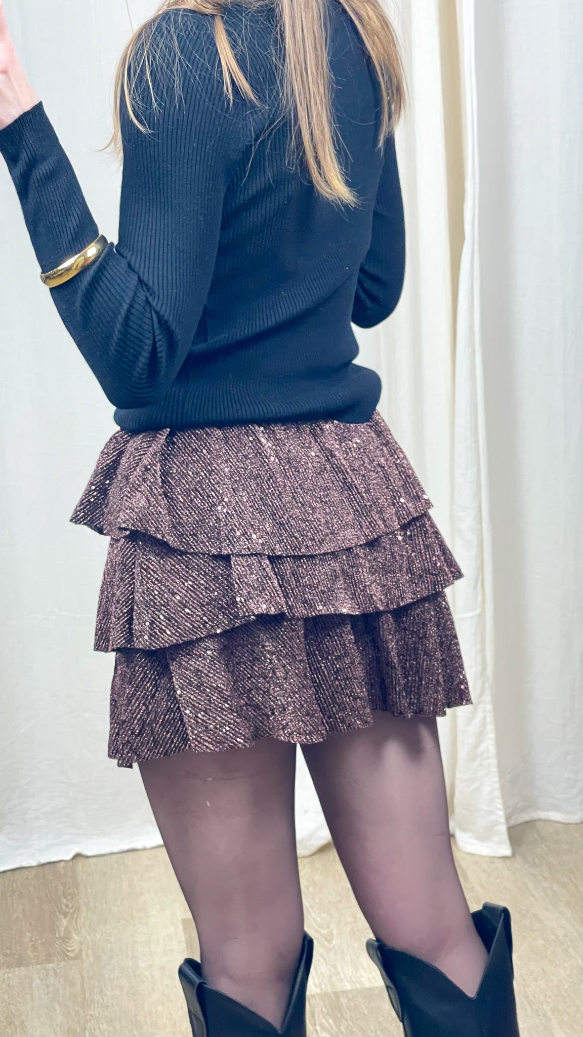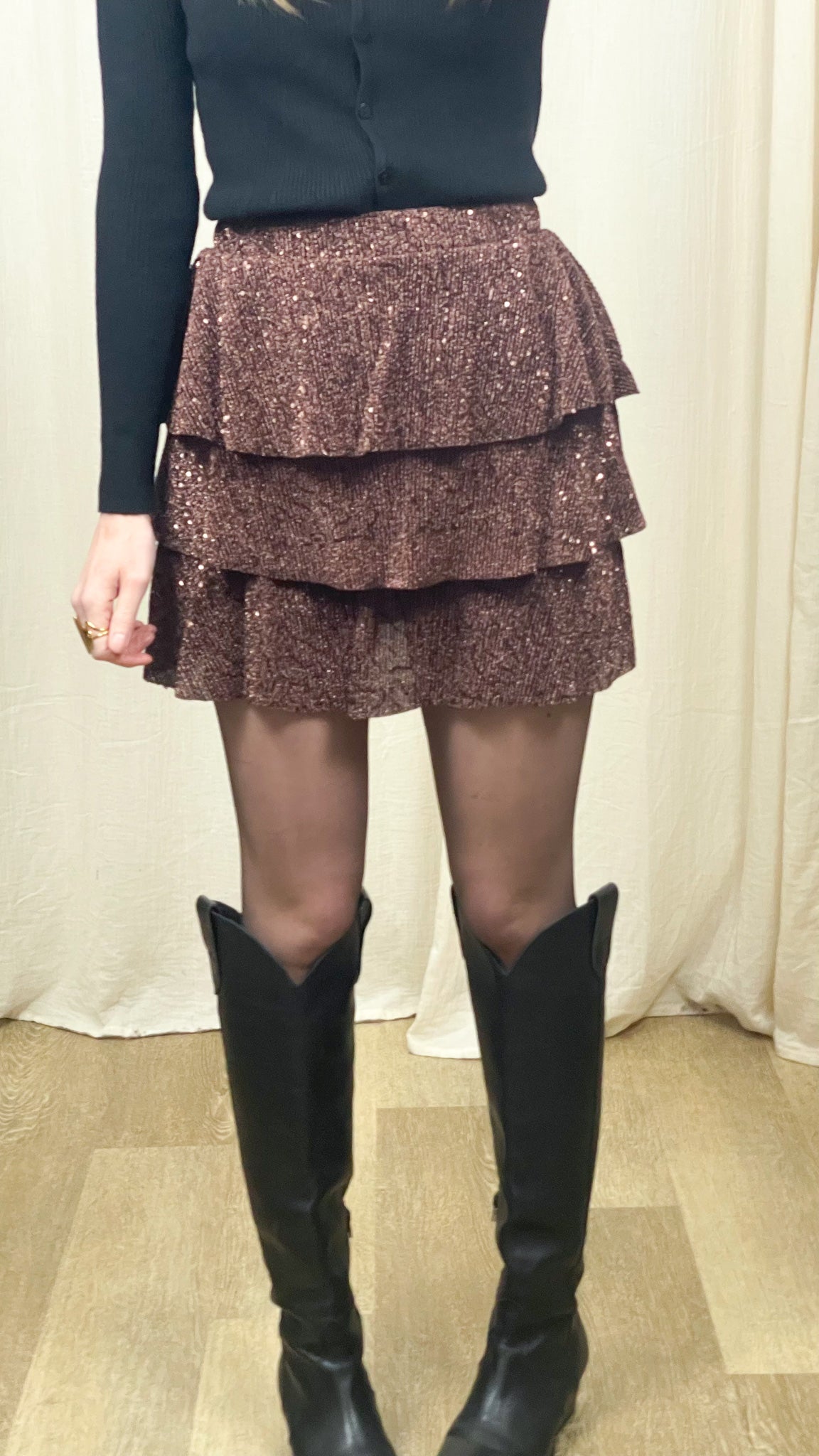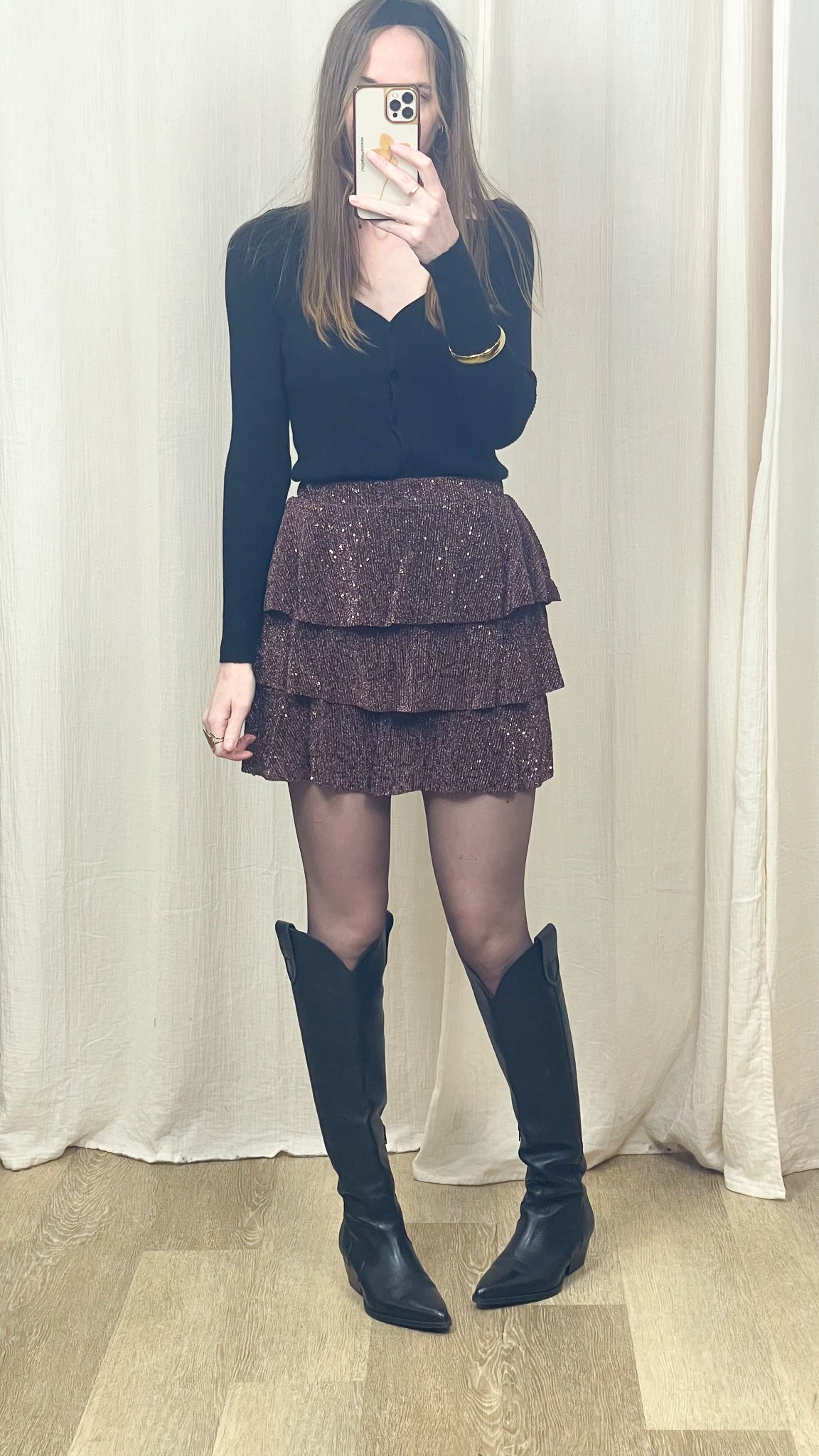 La Jupe Alma apporte instantanément une touche festive et élégante à vos tenues. Avec ses trois volants aériens et son tissu pailleté, elle joue parfaitement entre mouvement, lumière et féminité. Une pièce idéale pour les fêtes, une soirée ou simplement pour relever un look du quotidien.