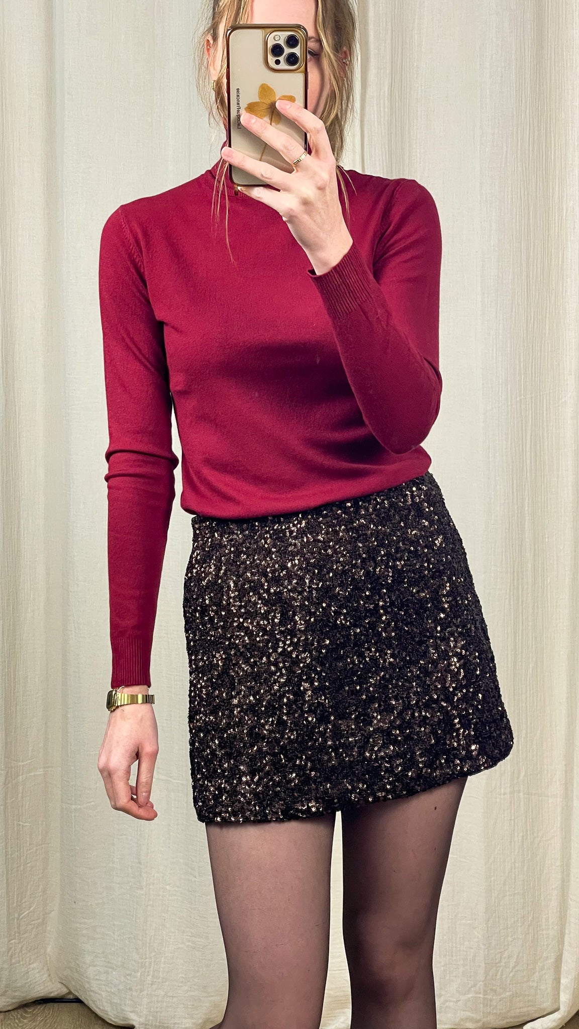 Associez la Jupe Arya à un pull col roulé pour un contraste chic et moderne, ou à un top satiné pour un look 100 % glamour. Elle se marie aussi parfaitement avec une paire de bottines ou des talons pour illuminer vos soirées de fin d’année.