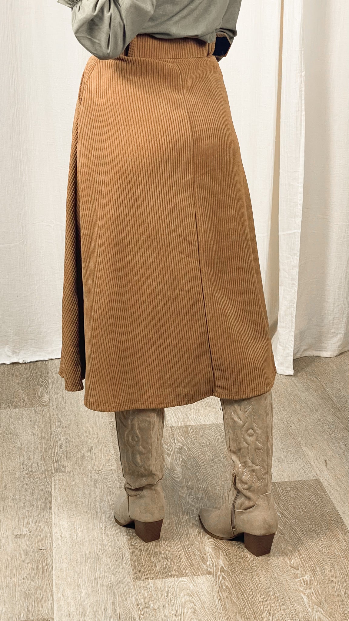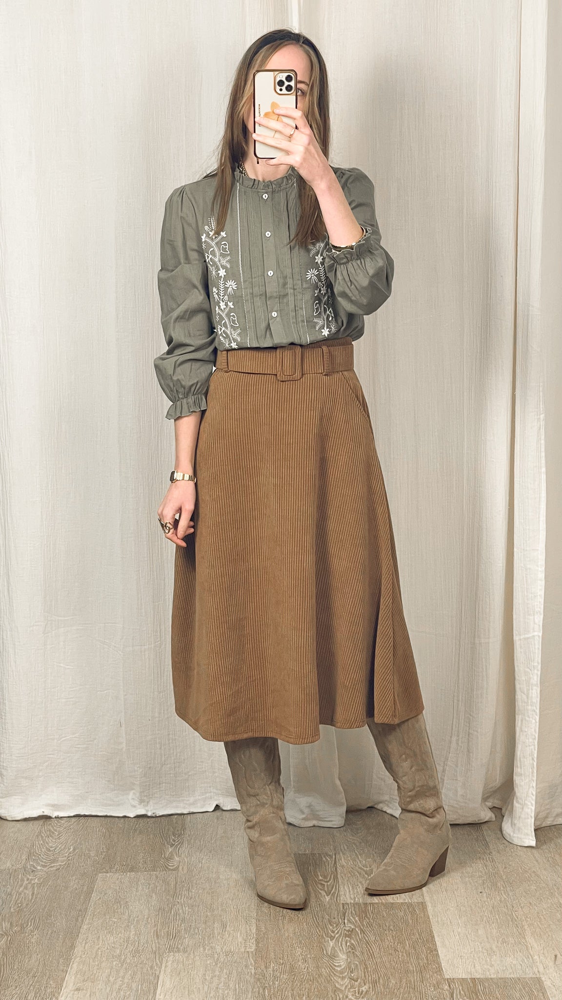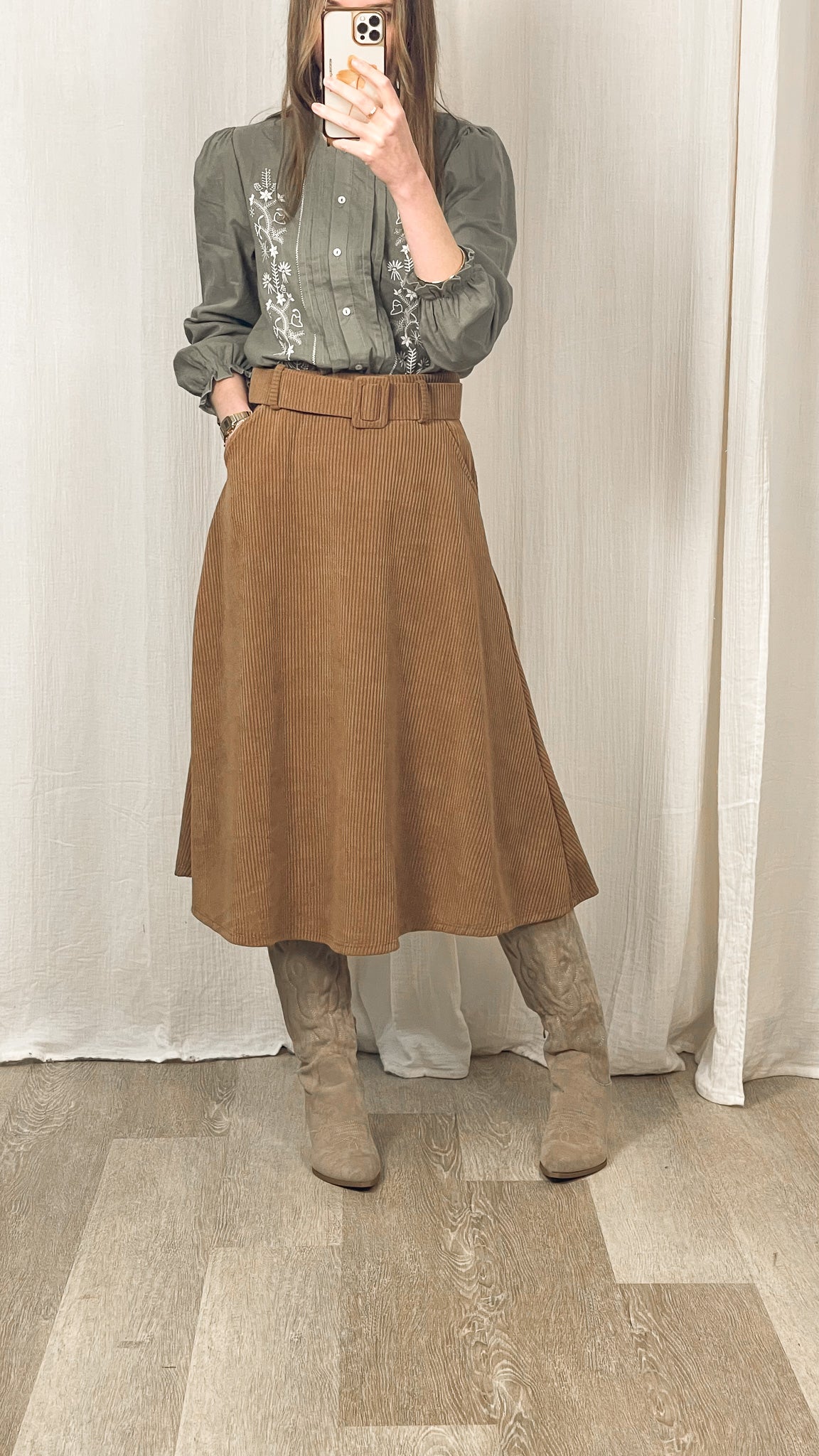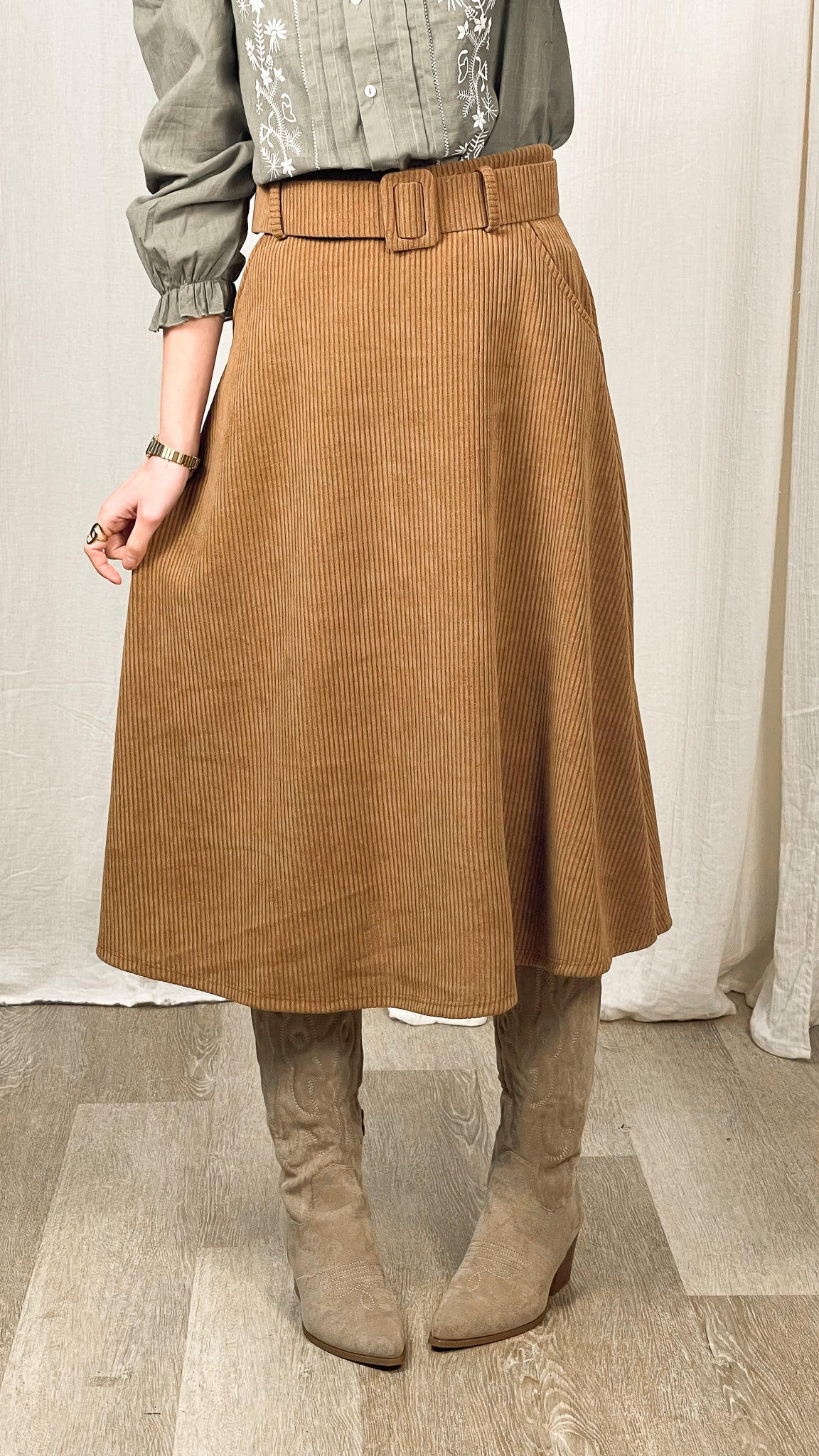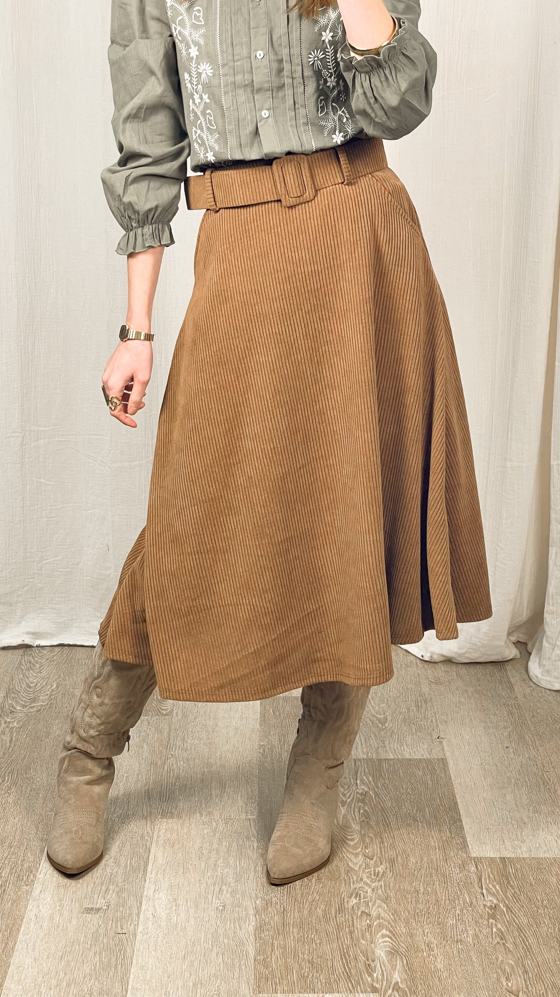 La Jupe Luna apporte une touche vintage et féminine à vos tenues d’automne. Confectionnée en velours côtelé doux et structuré, elle offre un tombé fluide et une belle tenue. Sa ceinture ton sur ton souligne la taille avec élégance, tandis que sa longueur midi met en valeur la silhouette sans effort.
