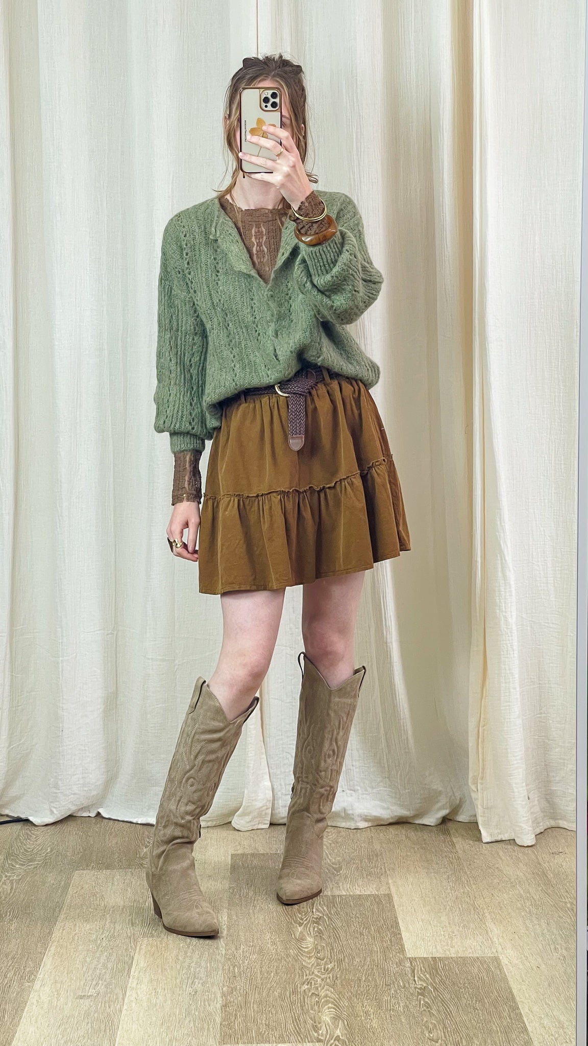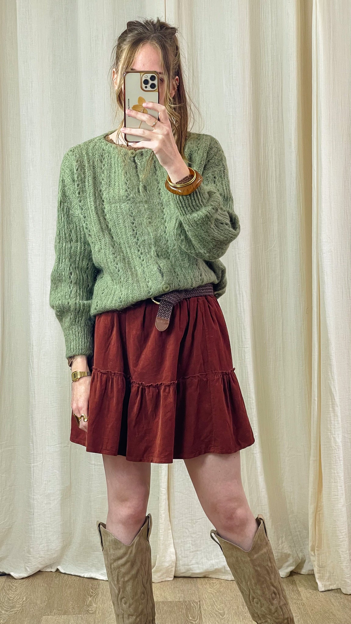 La Jupe Sarah est une pièce coup de cœur qui allie douceur et style rétro. Confectionnée en velours côtelé, elle apporte une texture chaleureuse et tendance à vos tenues d’automne.