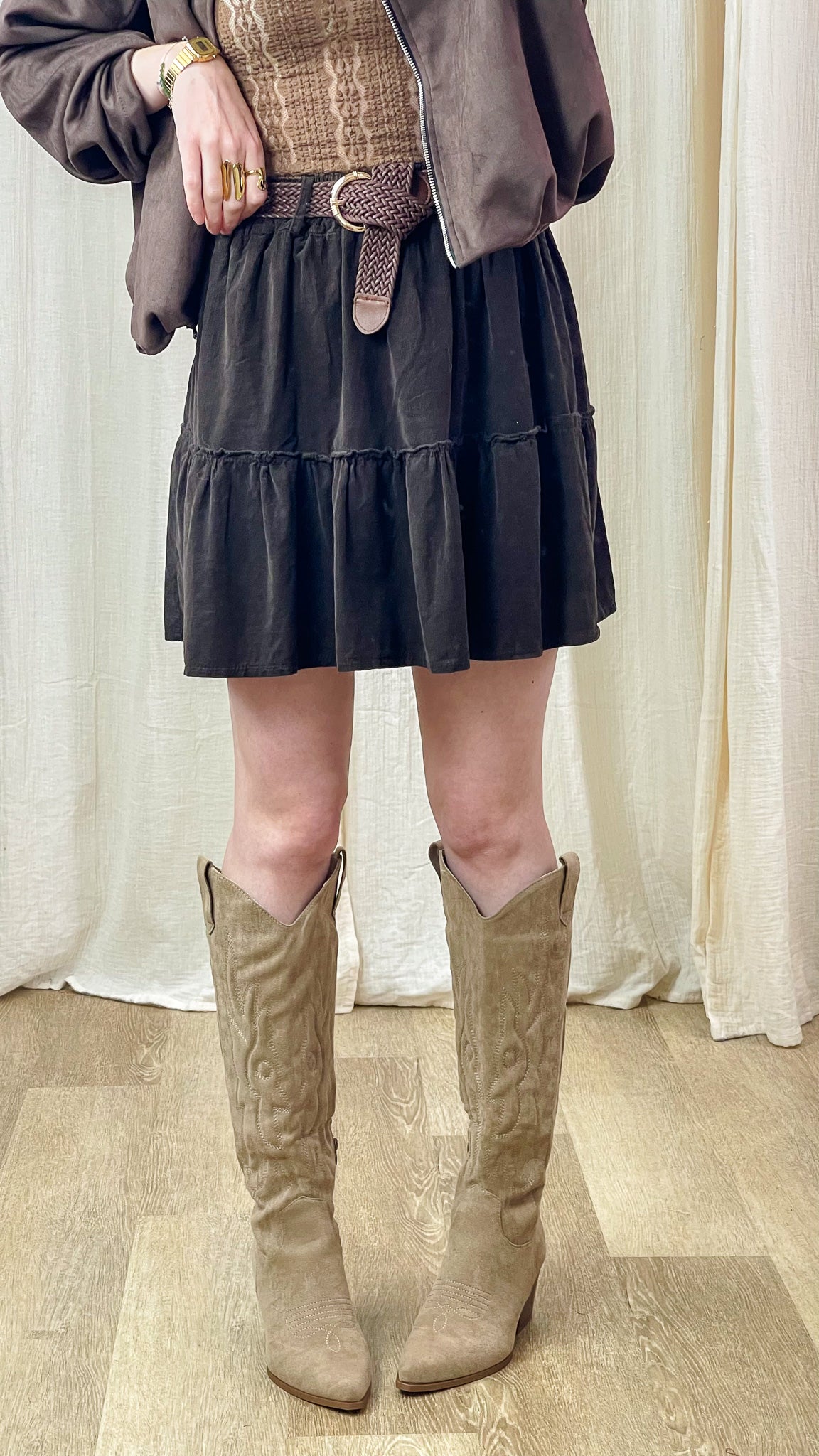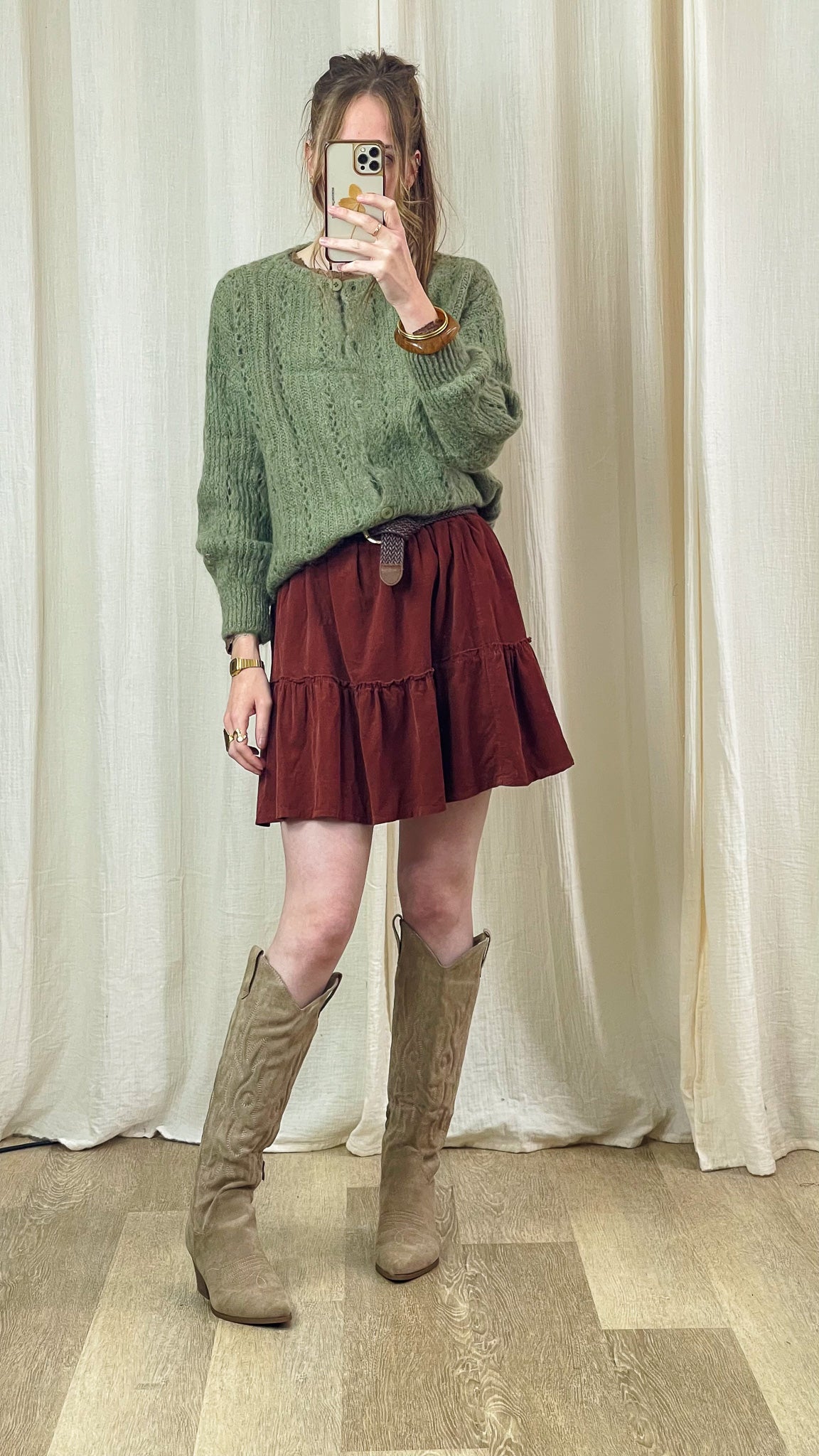 Associez la Jupe Sarah à un pull moelleux et des bottes hautes pour un look bohème chic, ou à un blazer pour une allure plus citadine. Une pièce polyvalente qui traverse les saisons sans perdre de son charme.