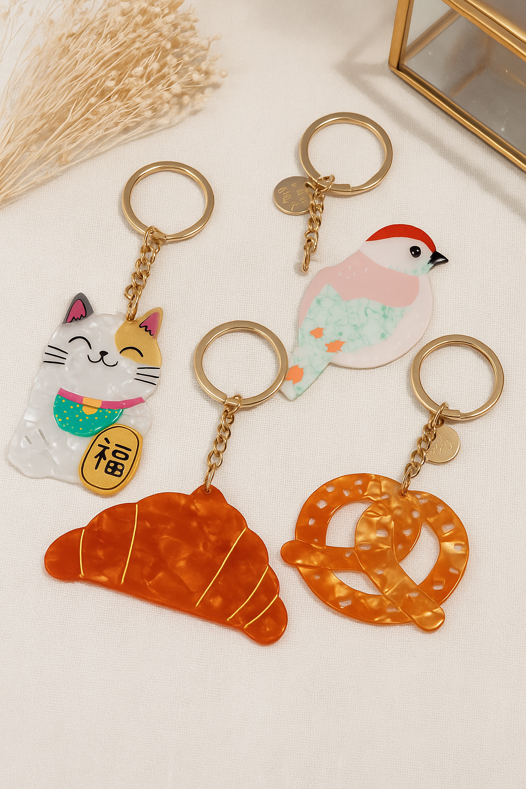 Ajoutez une dose de mignonnerie à votre quotidien avec nos porte-clés fantaisie, de petites pièces décoratives parfaites pour personnaliser vos clés, sacs ou trousses. Leur finition nacrée et leur petite chaîne dorée apportent une touche tendance et lumineuse, idéale pour un petit cadeau qui fait plaisir.