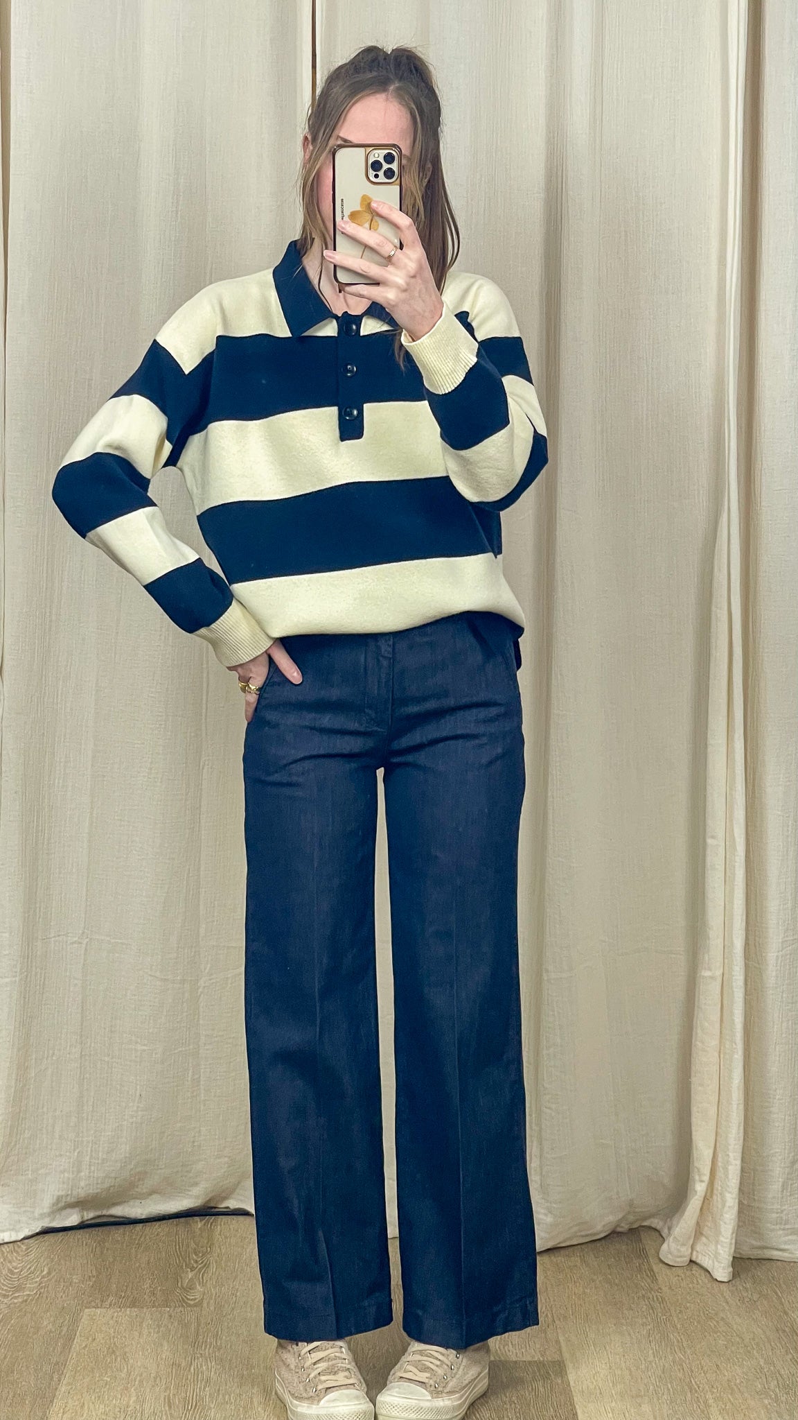 Le pull Louise revisite l’incontournable esprit marin avec une allure chic et décontractée. Ses larges rayures écrues et bleu marine apportent une touche intemporelle, tandis que son col polo boutonné structure joliment la silhouette.