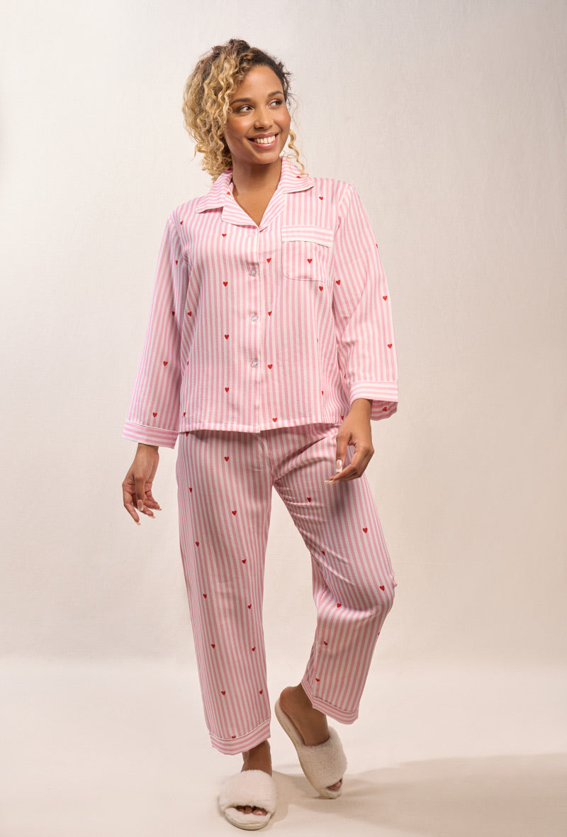 Ce pyjama rayé rose parsemé de petits cœurs est la définition même du confort mignon. À la fois doux, léger et agréable à porter, il enveloppe les moments de détente d’une touche de tendresse. Son look féminin et chaleureux en fait un incontournable pour les nuits cocooning comme pour les matinées à la maison.