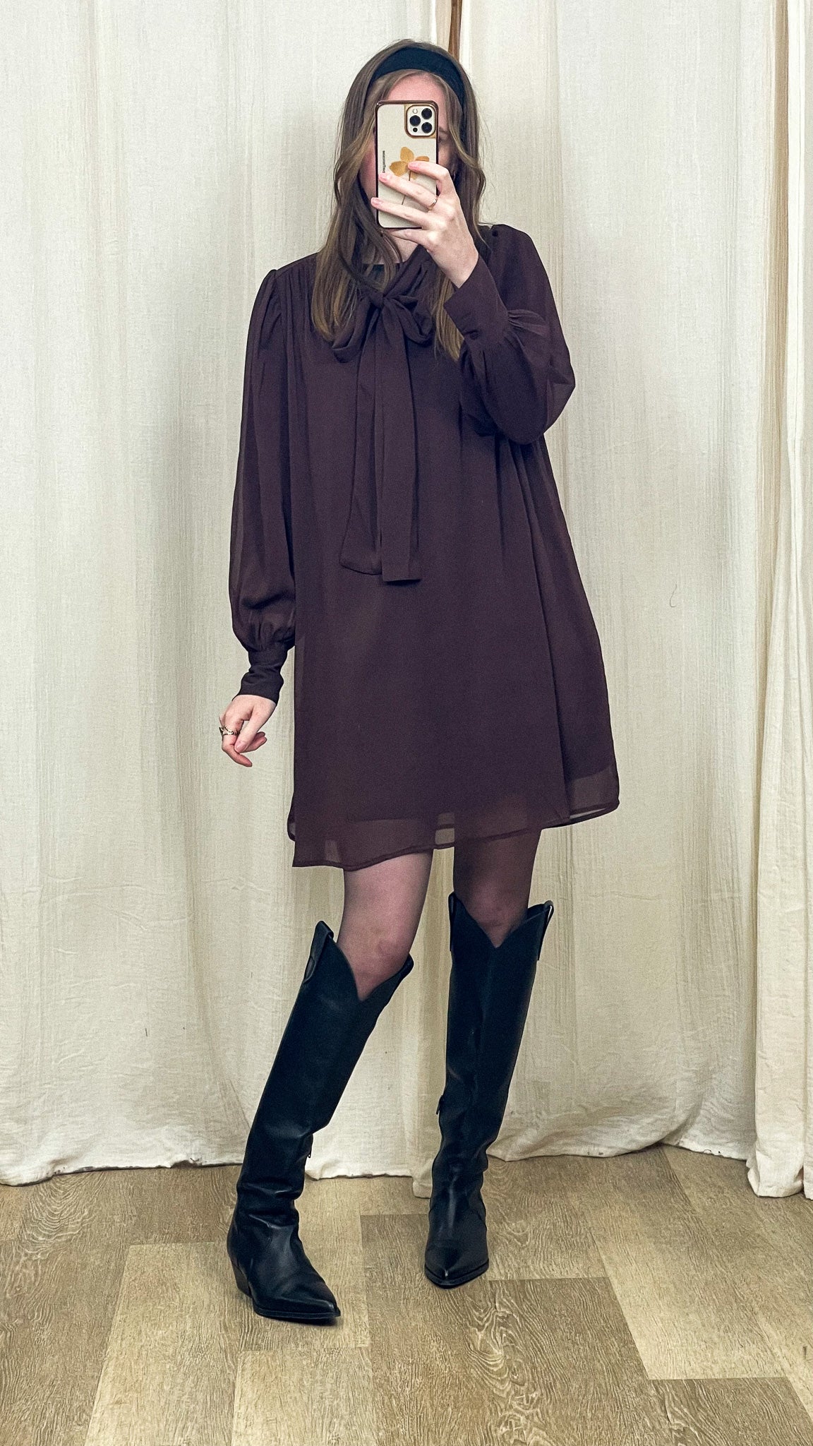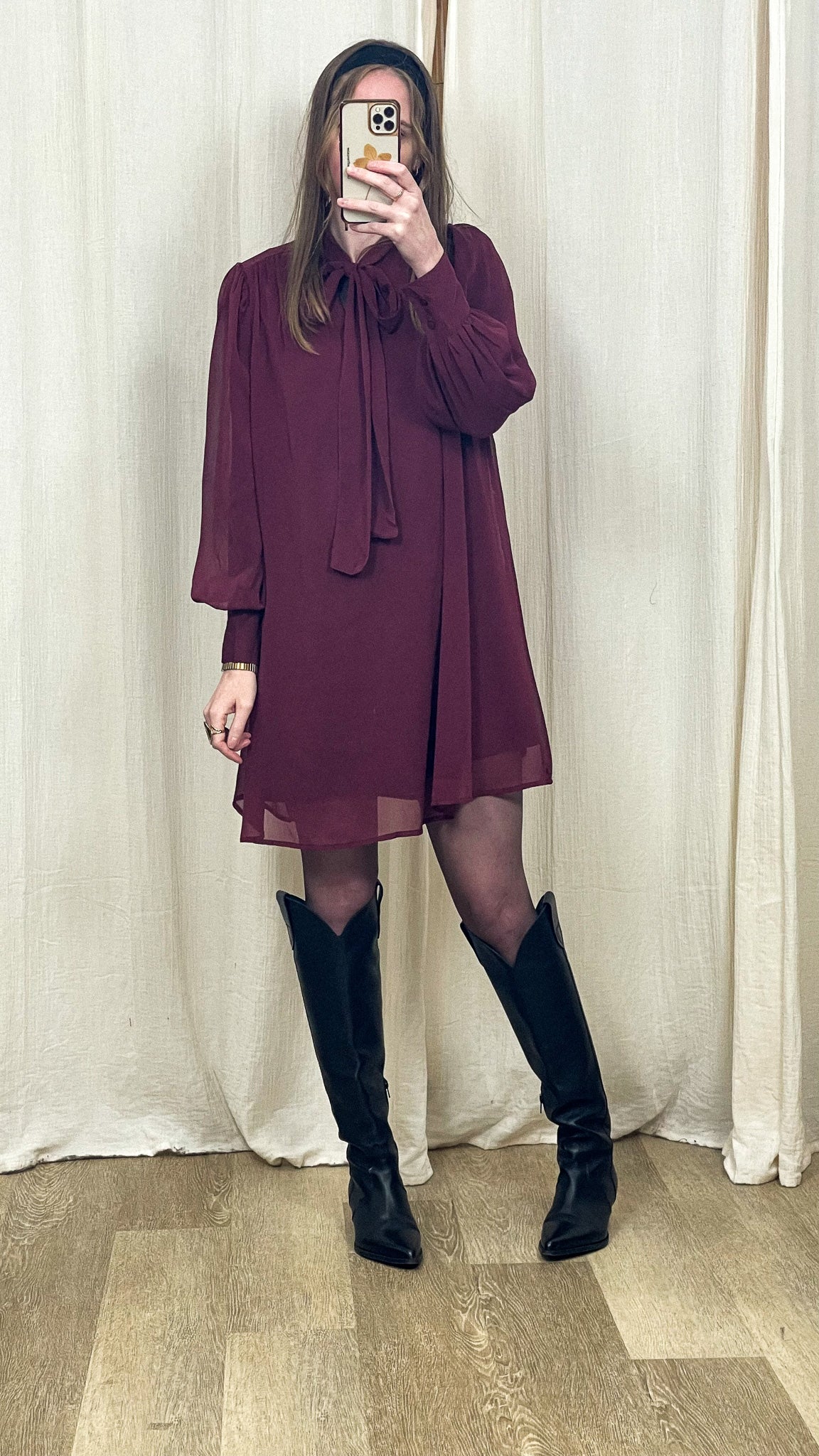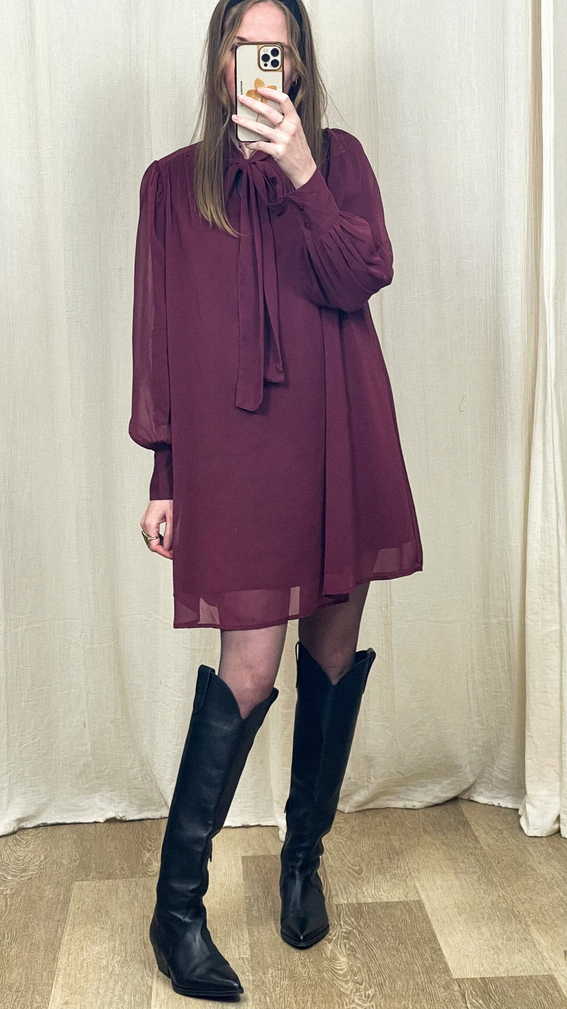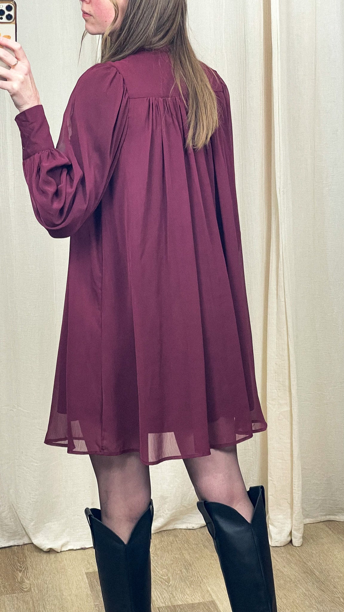 Porte la Robe Astride avec des bottes hautes pour une allure élégante et affirmée, ou avec des mocassins pour un style plus citadin. Ajoute une ceinture à la taille pour structurer la silhouette et quelques accessoires dorés pour un rendu encore plus chic.