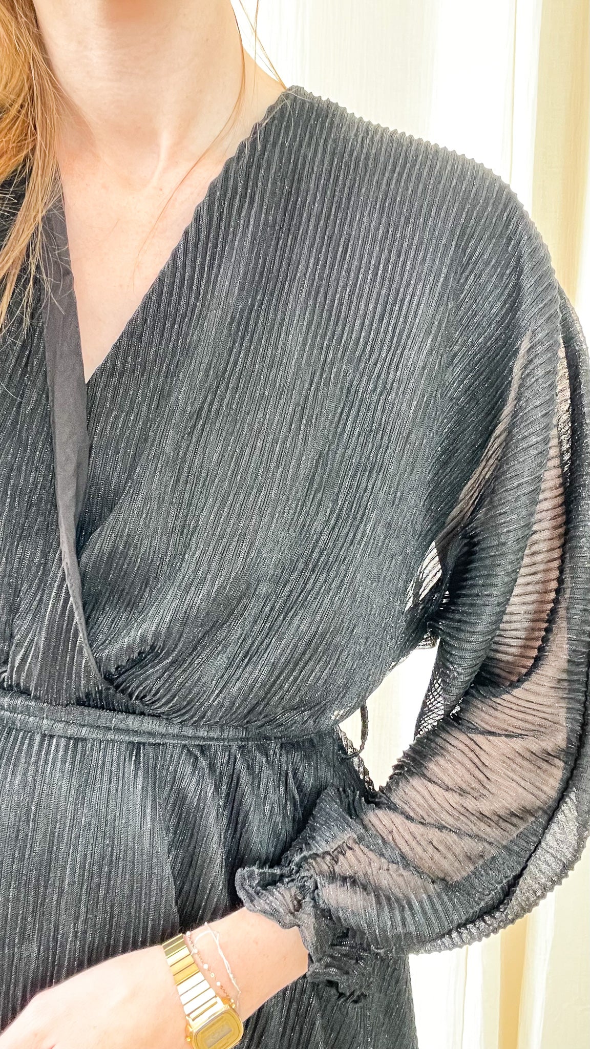 Élégante et intemporelle, la robe Jessie séduit par sa coupe portefeuille revisitée et ses détails plissés raffinés. Légère et fluide, elle est sublimée par des manches longues transparentes et une taille marquée par une ceinture à nouer, pour une silhouette féminine et moderne.