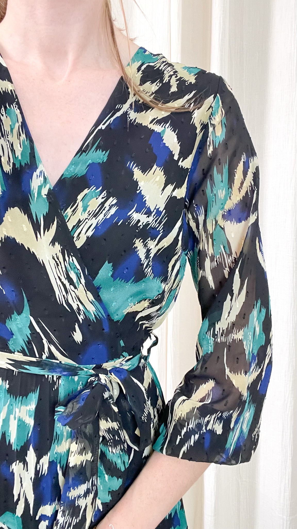 La Robe Sloane est une pièce fluide et élégante qui sublime la silhouette grâce à sa coupe portefeuille. Son imprimé artistique aux nuances de bleu, vert et beige apporte du caractère et de la modernité, tandis que son tissu léger assure un confort optimal. Parfaite pour vos journées habillées comme pour vos soirées, elle s’impose comme une robe féminine et intemporelle.