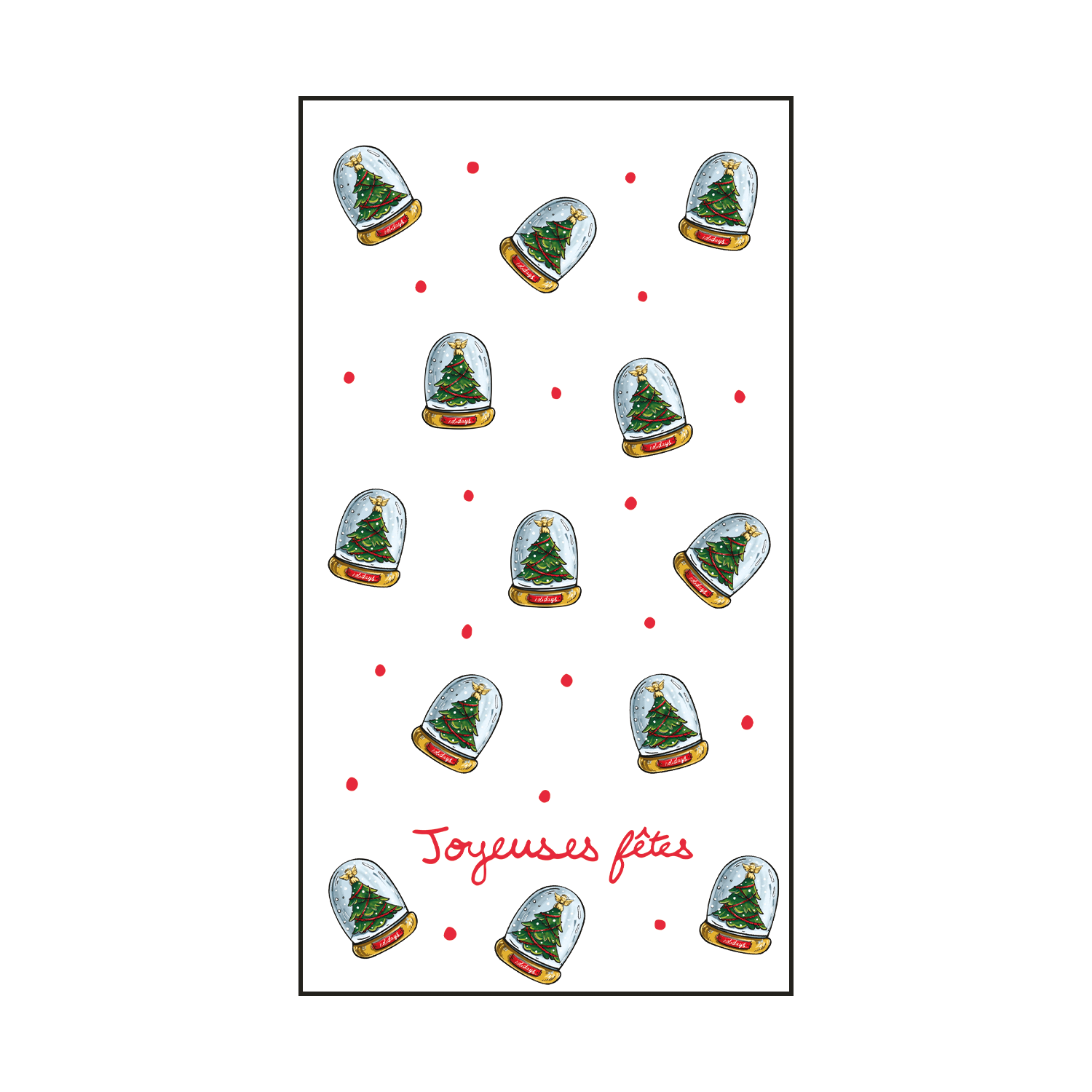 Apportez une touche festive et pleine de charme à votre table avec ces serviettes en papier rectangulaires décorées de sapins sous boule à neige. Leur illustration délicate, ponctuée de petits pois rouges et du message Joyeuses fêtes, crée une ambiance chaleureuse et conviviale, parfaite pour les repas de fin d’année.