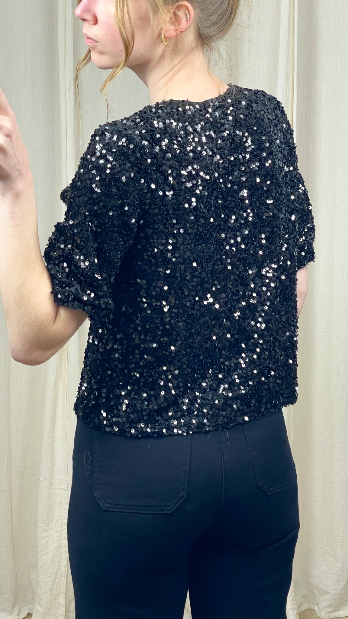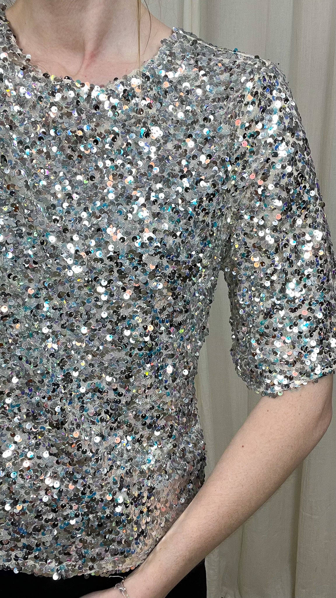 Le T-shirt Chloé est la pièce lumineuse par excellence : entièrement recouvert de sequins, il apporte instantanément du style et une touche festive à n’importe quel look. Sa coupe droite et confortable en fait un top facile à porter, aussi bien en version argentée ultra lumineuse qu’en noir chic et intemporel. Parfait pour briller sans effort.