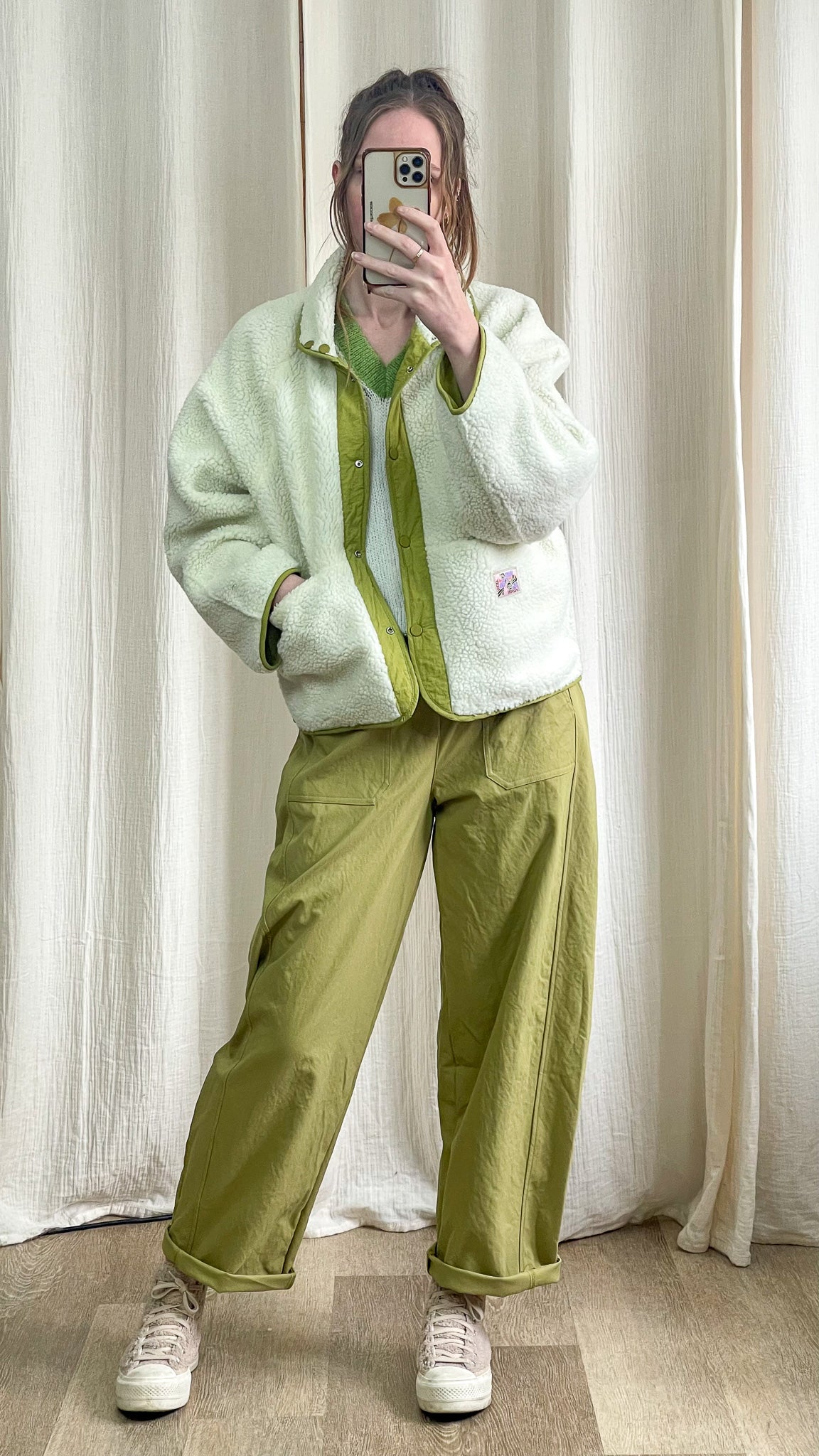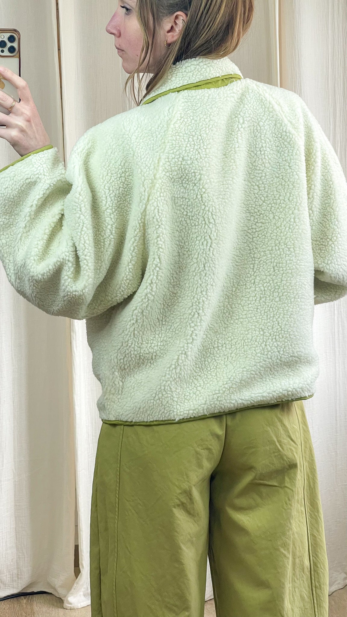 La veste Olive est une pièce cosy et tendance, parfaite pour la mi-saison et les journées plus fraîches. Entièrement réversible, elle offre deux styles en un : un côté sherpa écru ultra doux pour un look cocooning, et un côté vert olive au toucher légèrement texturé pour une allure plus urbaine.